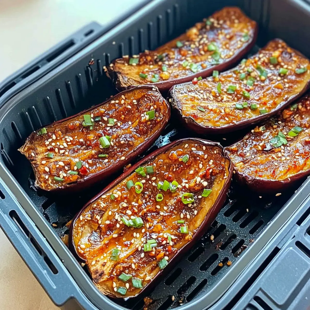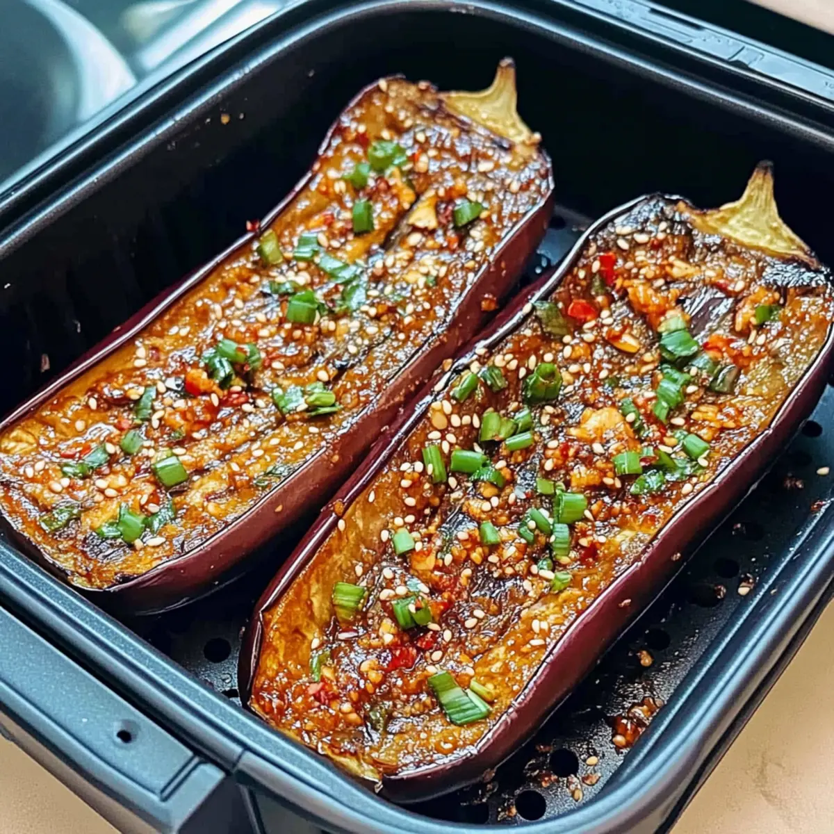 - Final Cooking: After frying, open each eggplant half with a fork and drizzle the sauce inside. Increase air fryer to 400°F (200°C) and air fry for another 7 minutes.