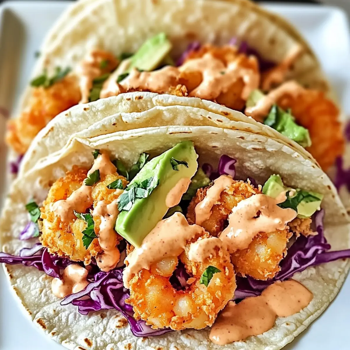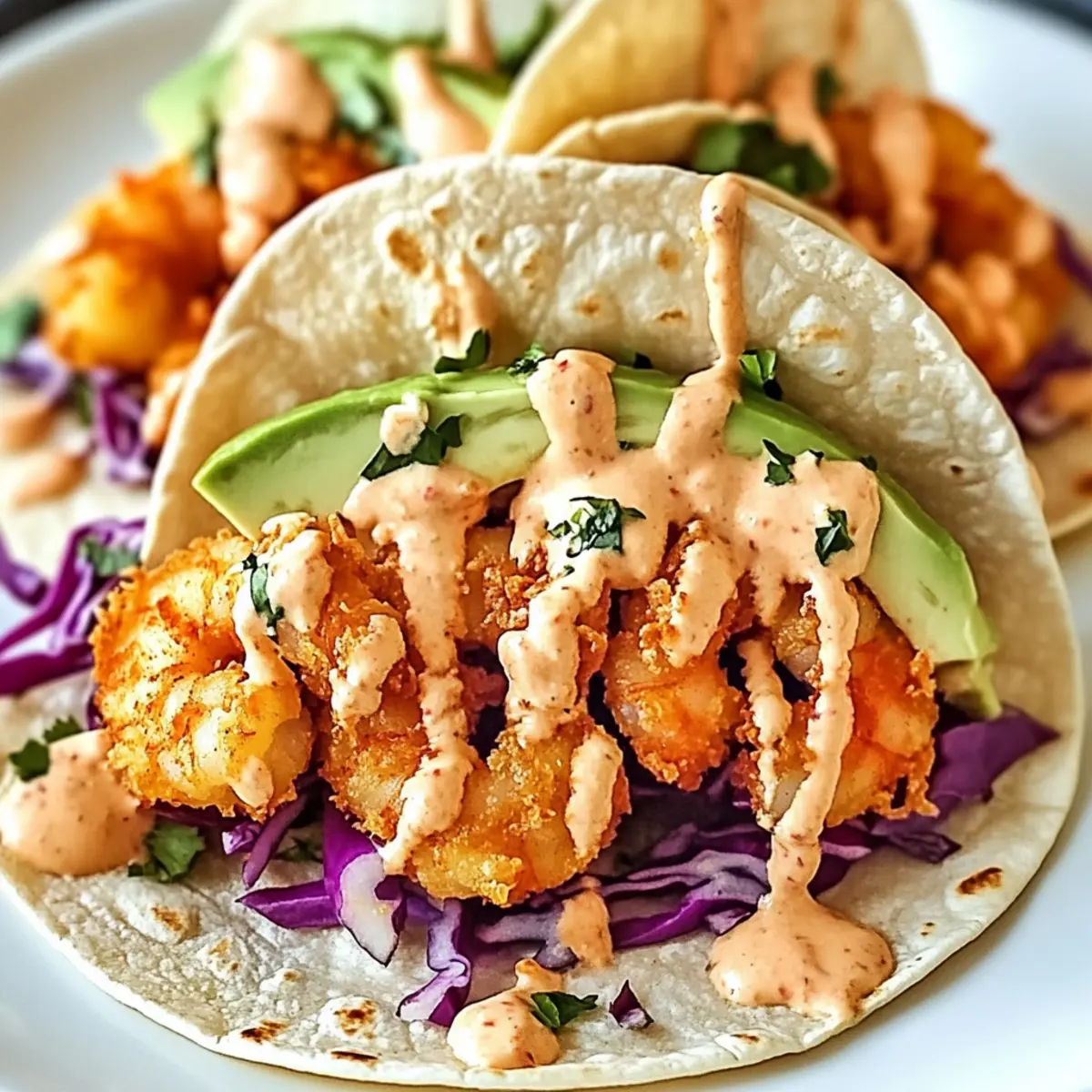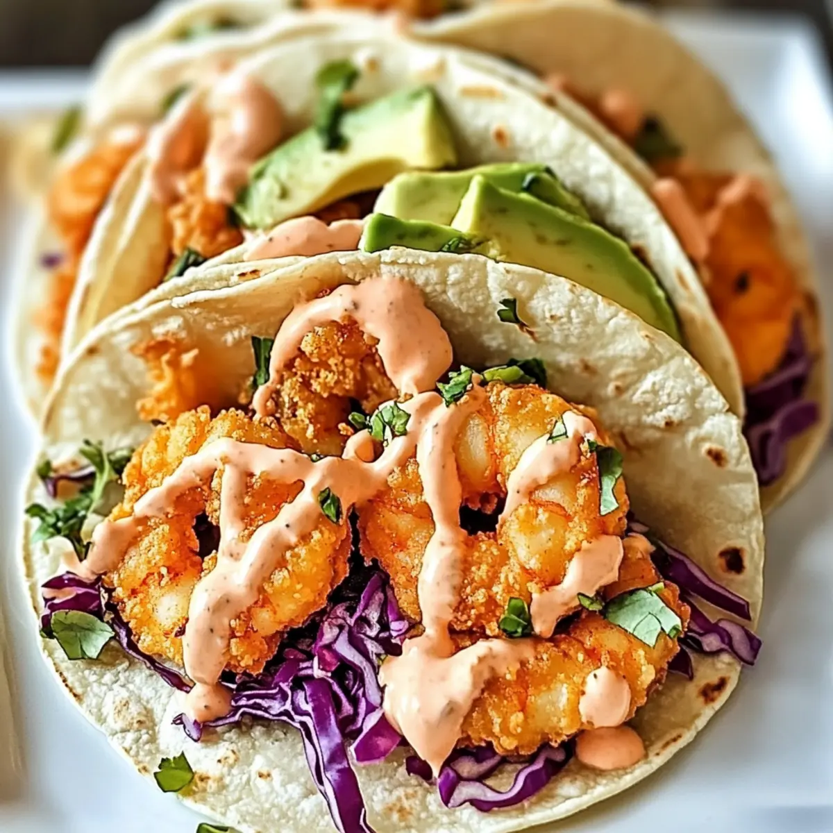 - Assemble the tacos by layering tortillas with cabbage, crispy shrimp, and Bang Bang sauce, then add avocado slices.