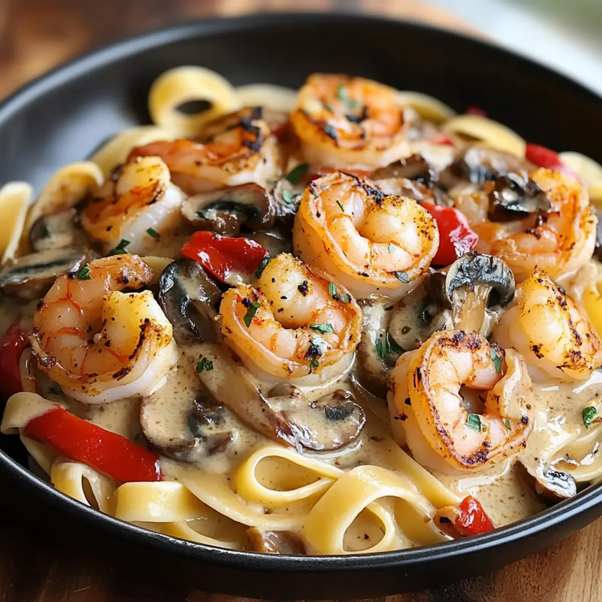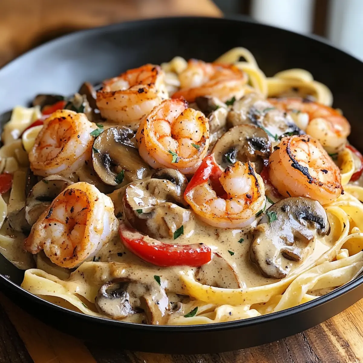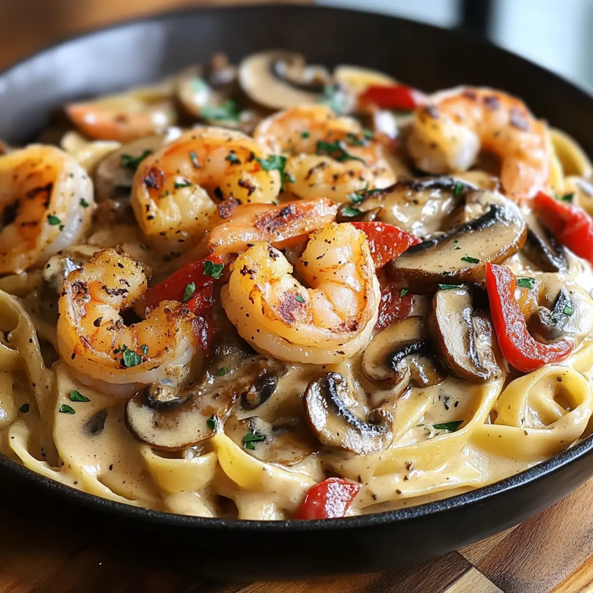 Return the sautéed mushrooms, shrimp, roasted red bell peppers, and capers to the skillet, stirring gently to combine everything. Heat through for about 1-2 minutes, ensuring the shrimp and vegetables are warmed and integrated with the creamy sauce. The dish should begin to look vibrant and utterly enticing, ready for serving.