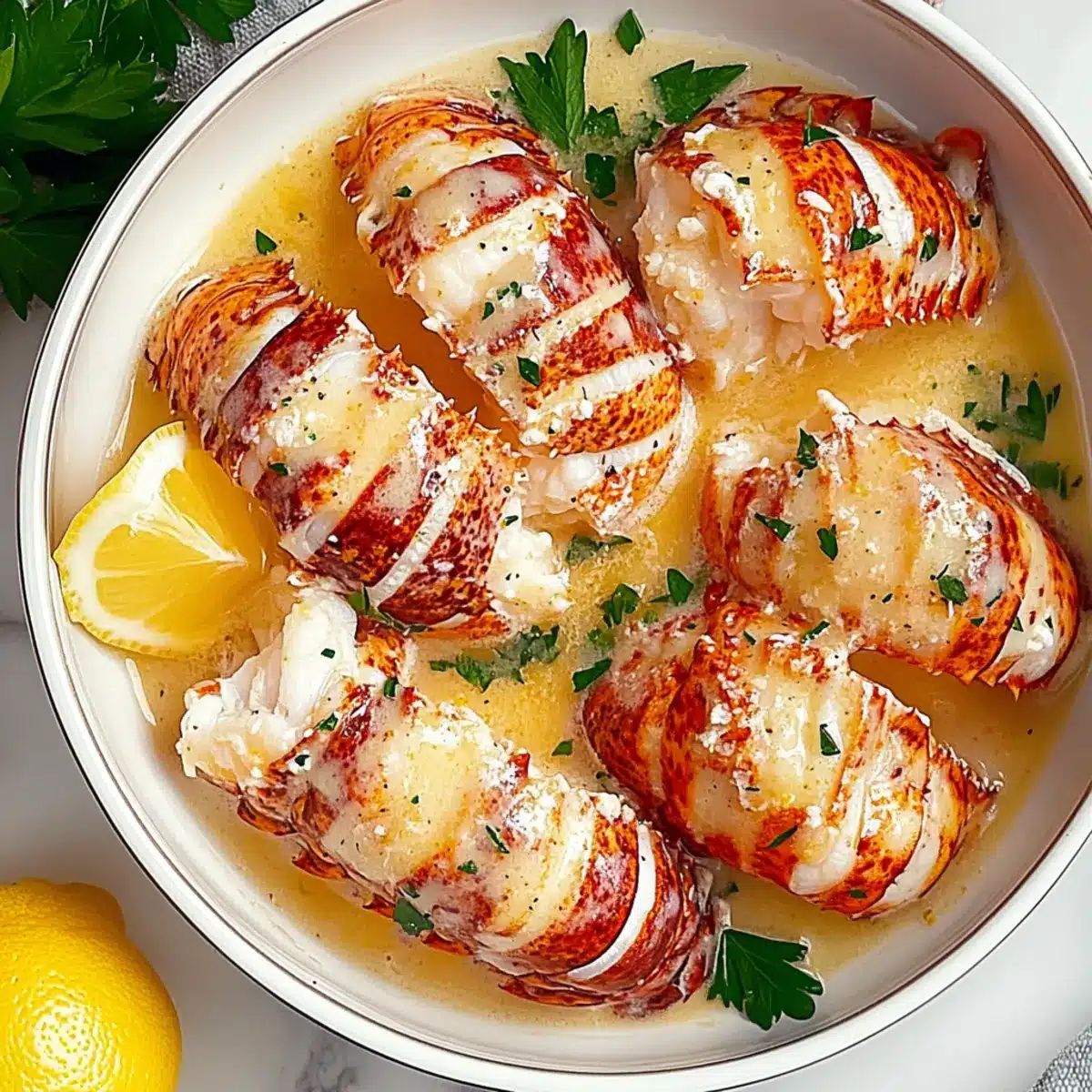 - Serve and Garnish: Remove the lobster tails, drizzle with garlic butter, and garnish with parsley and lemon wedges.
