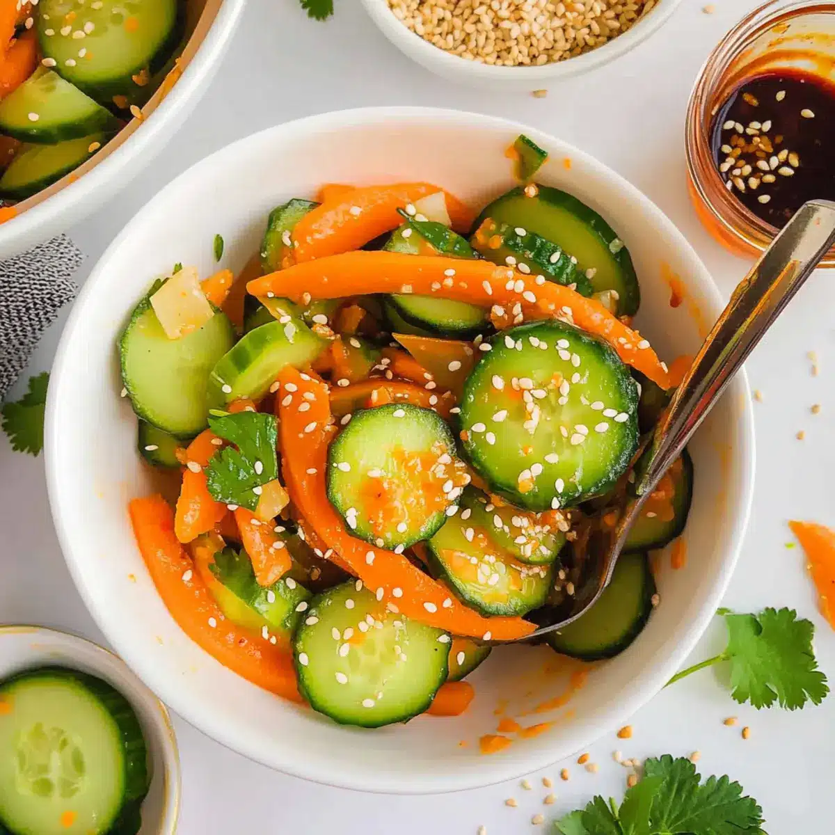 This Crisp Carrot and Cucumber Salad with Spicy Dressing is an excellent choice for meal prep! You can slice the carrots and cucumbers up to 24 hours in advance, keeping them in an airtight container in the refrigerator to maintain their crunch. The dressing can also be made ahead of time and stored separately in the fridge for up to 3 days. This not only saves time but ensures that your veggies stay fresh and don’t become soggy. When you’re ready to enjoy your salad, simply combine the prepped ingredients, drizzle the dressing over, and give it a gentle toss. You’ll have a vibrant, delicious dish with minimal effort, perfect for busy weeknights!