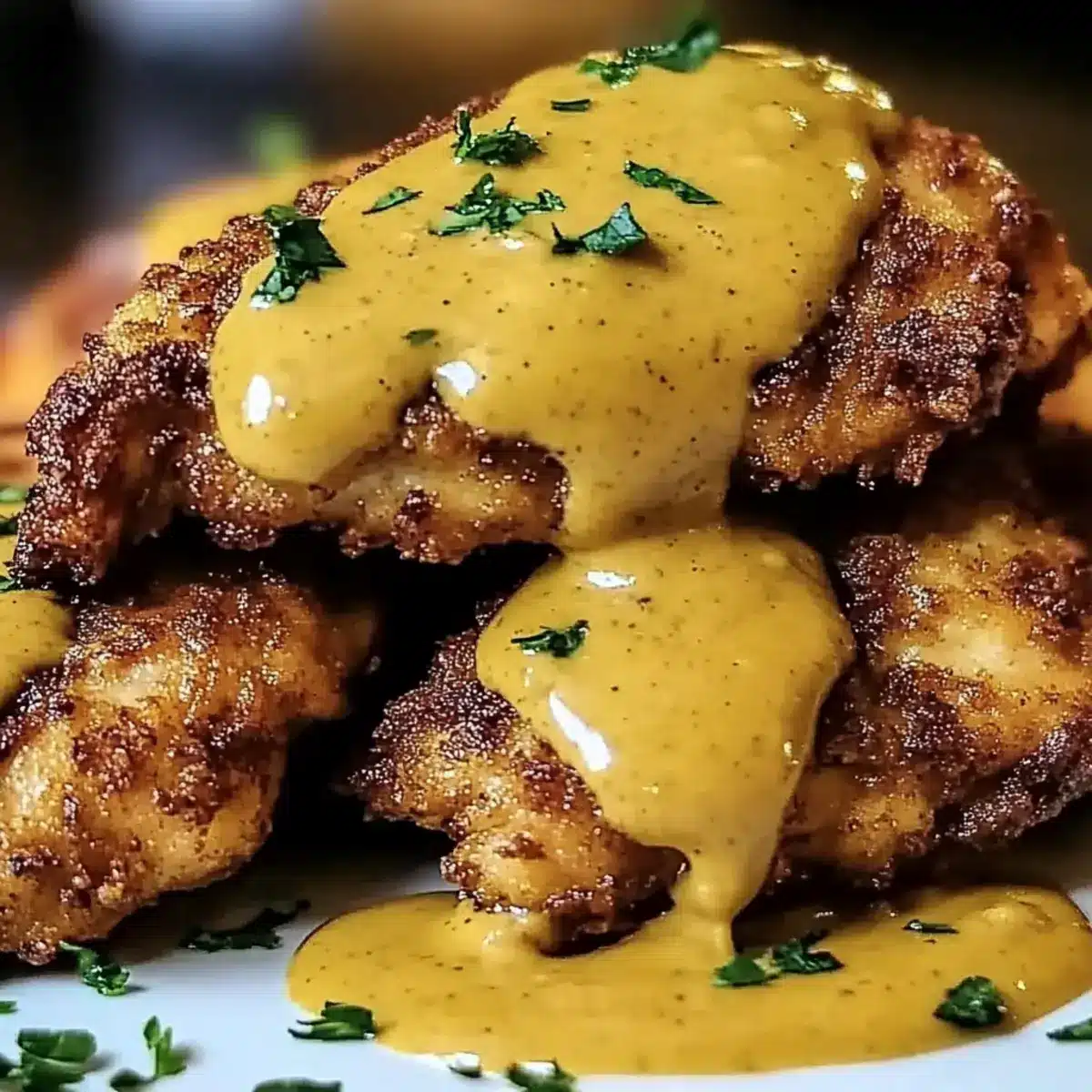 Crispy Pretzel Chicken with Mustard-Cheddar Sauce Delight