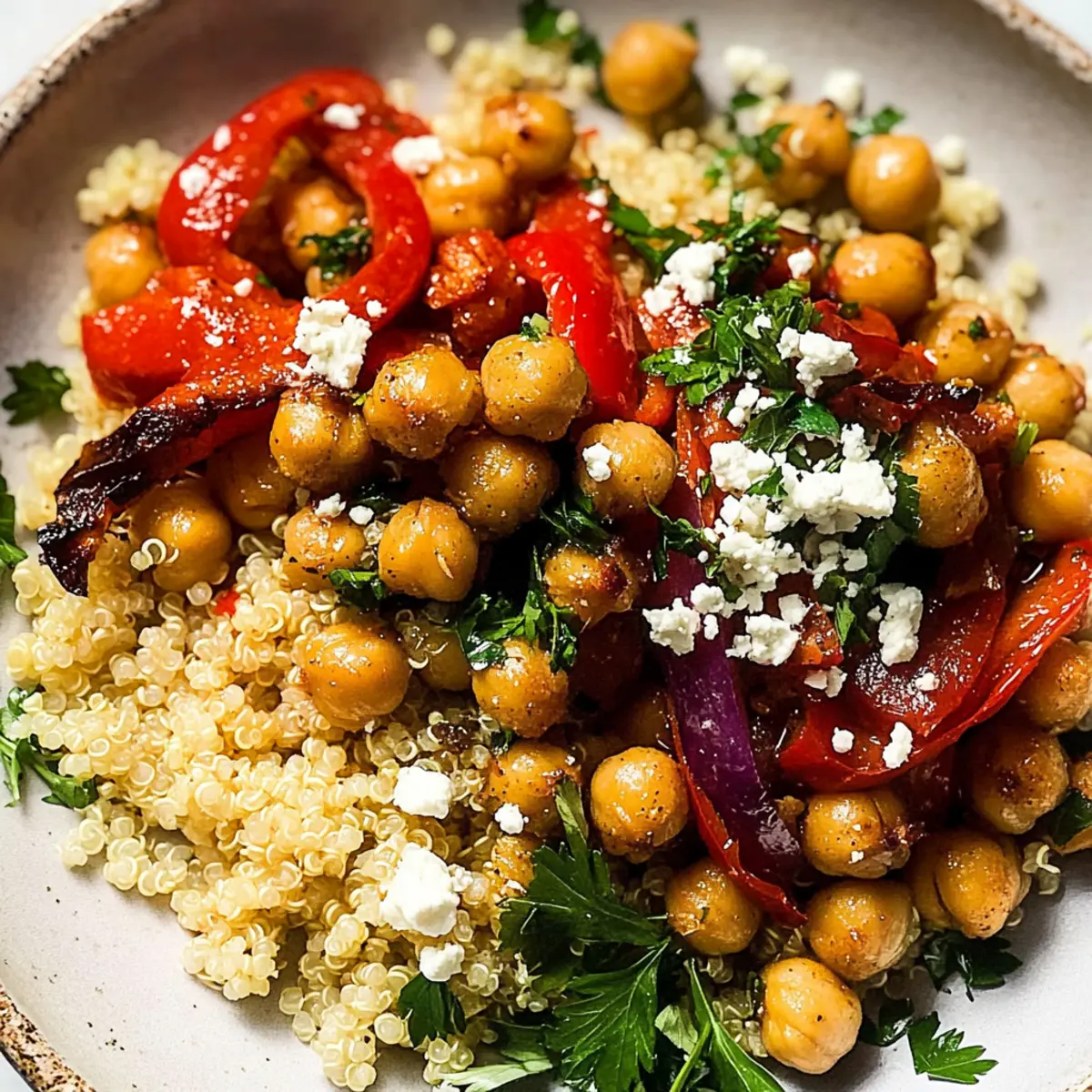 Roasted Red Pepper Salad Loaded with Crispy Chickpeas and Quinoa