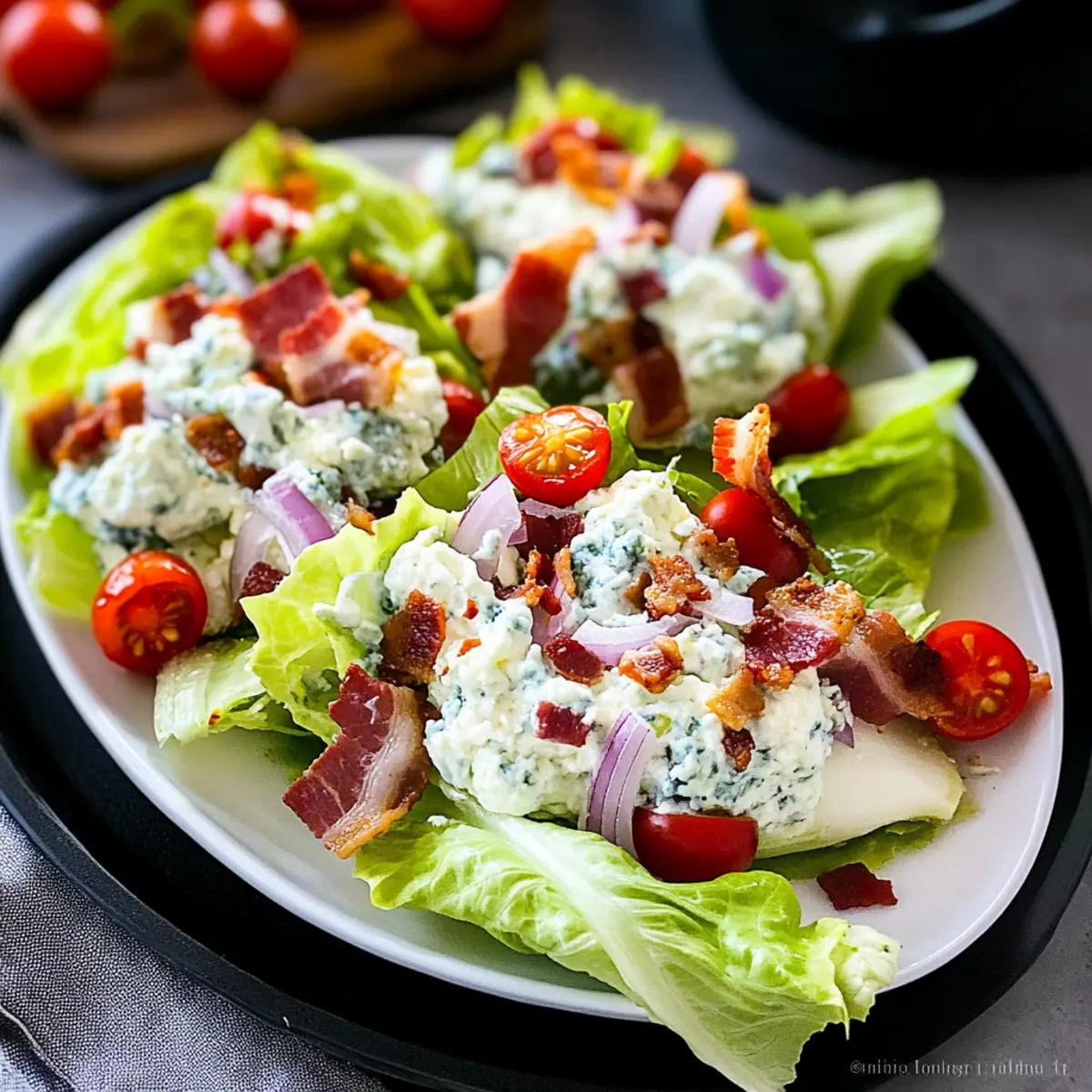 Drizzle half of the chilled blue cheese dressing over the wedges, allowing it to cascade down the sides. Next, sprinkle the salad with the halved cherry tomatoes, thinly sliced red onion, and crumbled bacon for added texture and flavor. Top with the remaining blue cheese and a few extra chives for a beautiful finish. Serve immediately, with the extra dressing on the side for those who crave that creamy bliss in every bite.