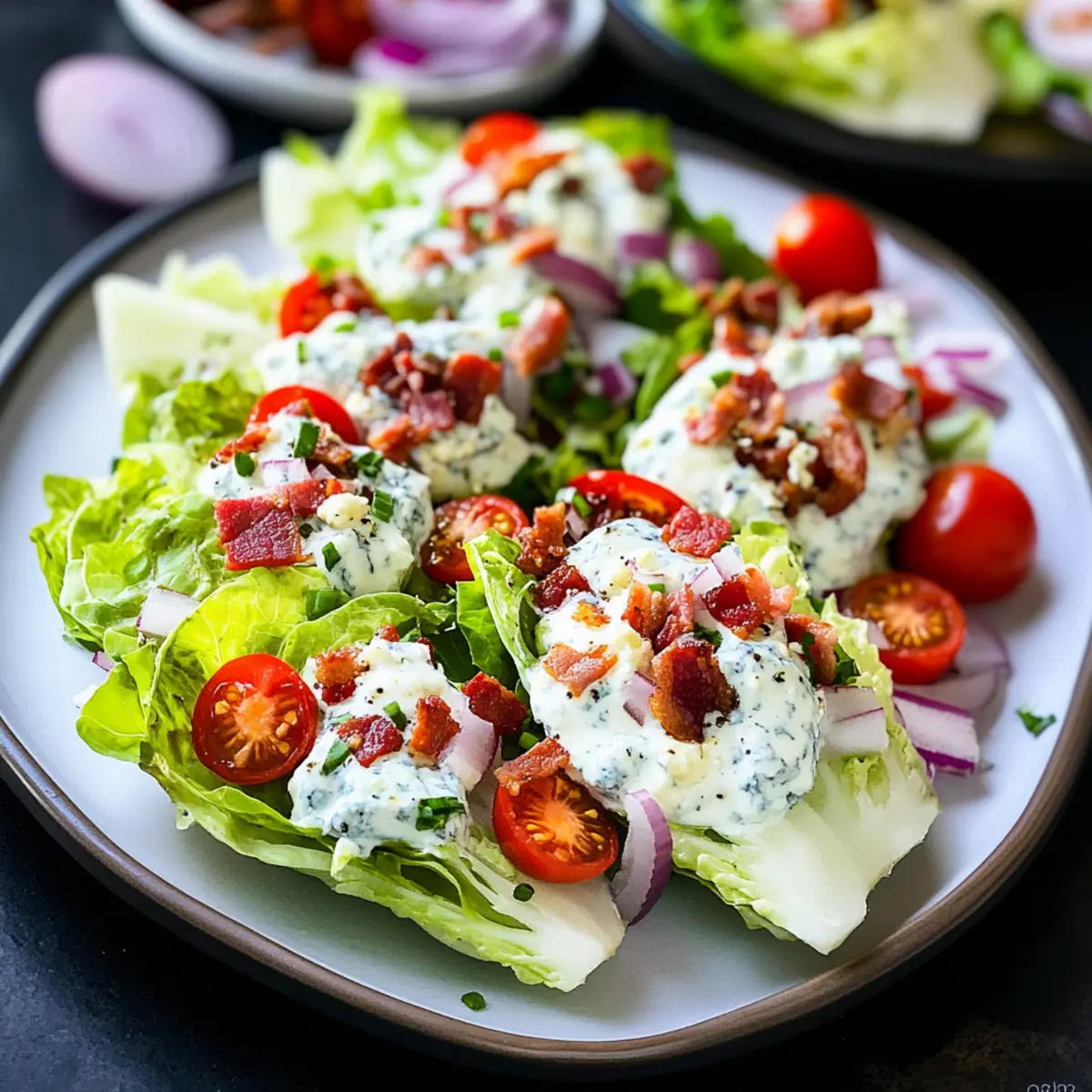 - Drizzle half of the blue cheese dressing over the wedges. Sprinkle with halved cherry tomatoes, sliced red onion, and crumbled bacon. Top with remaining blue cheese and chives. Serve immediately with extra dressing on the side.