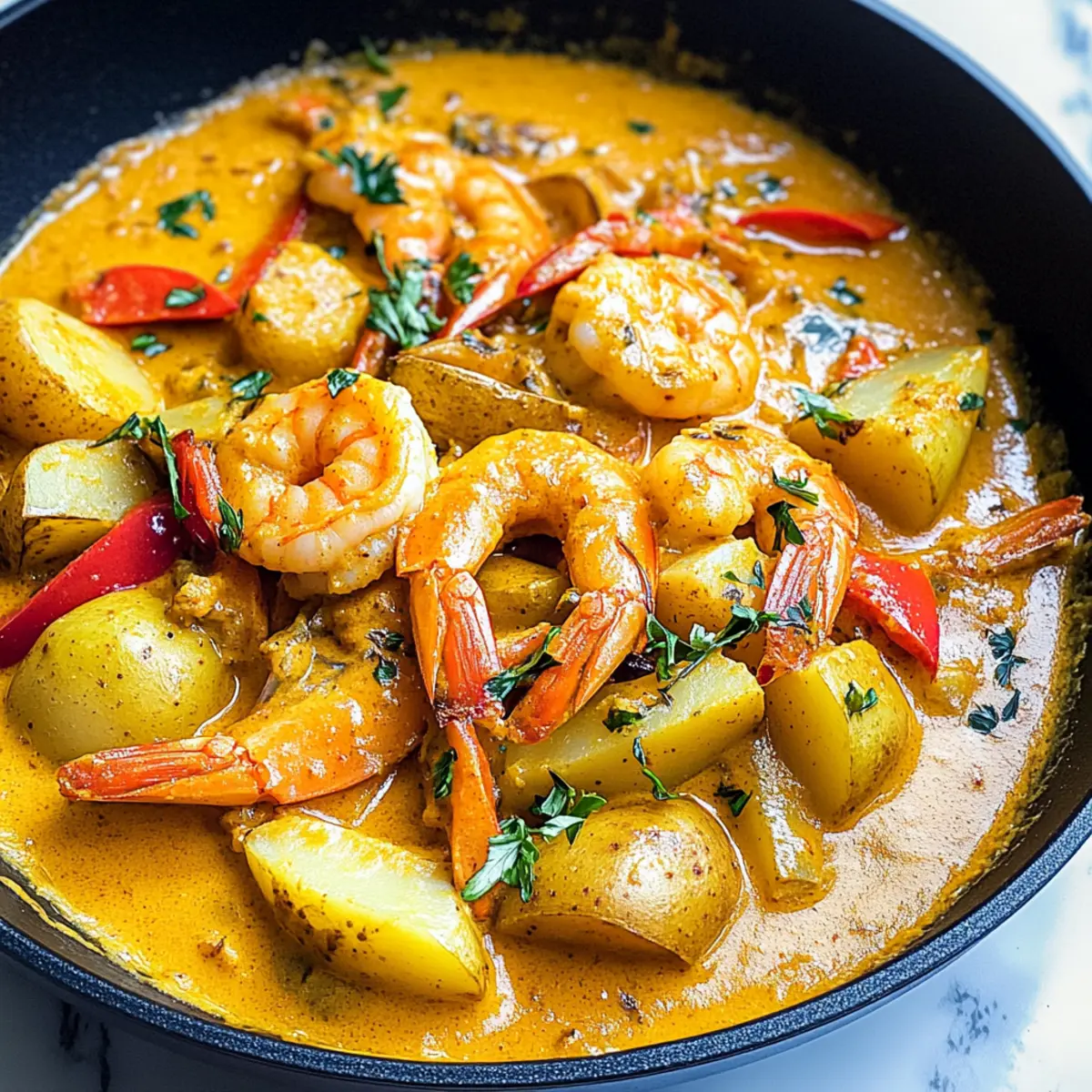Once the potatoes are tender, taste the curry and adjust seasoning if necessary. Gently fold in the marinated shrimp, stirring to coat them in the creamy sauce. Cover the pot again and let it cook for about 5 minutes, or until the shrimp turn pink and are just cooked through, preserving their juiciness.