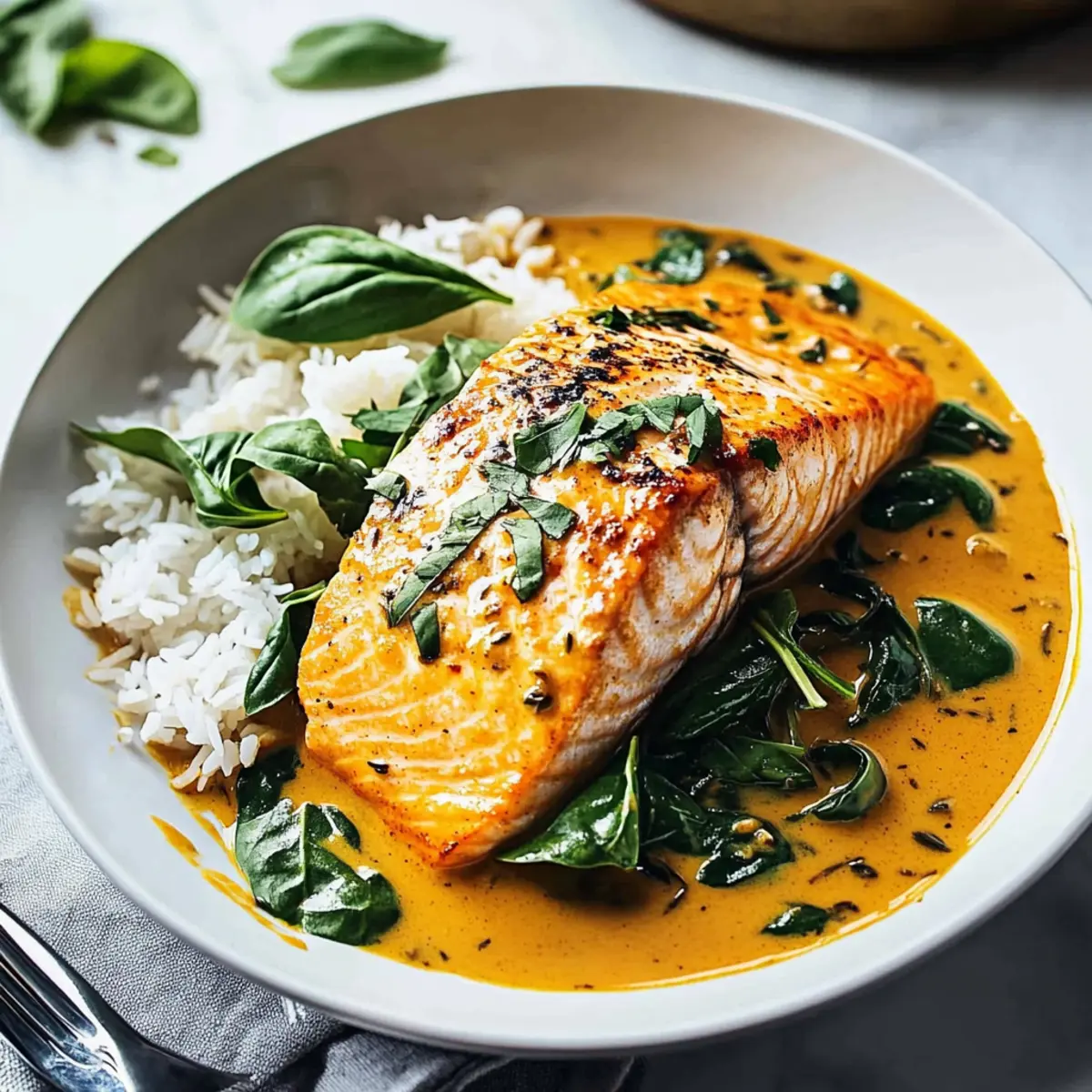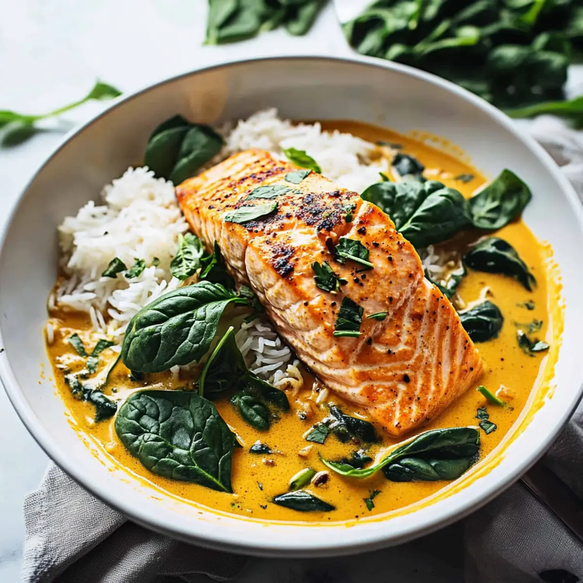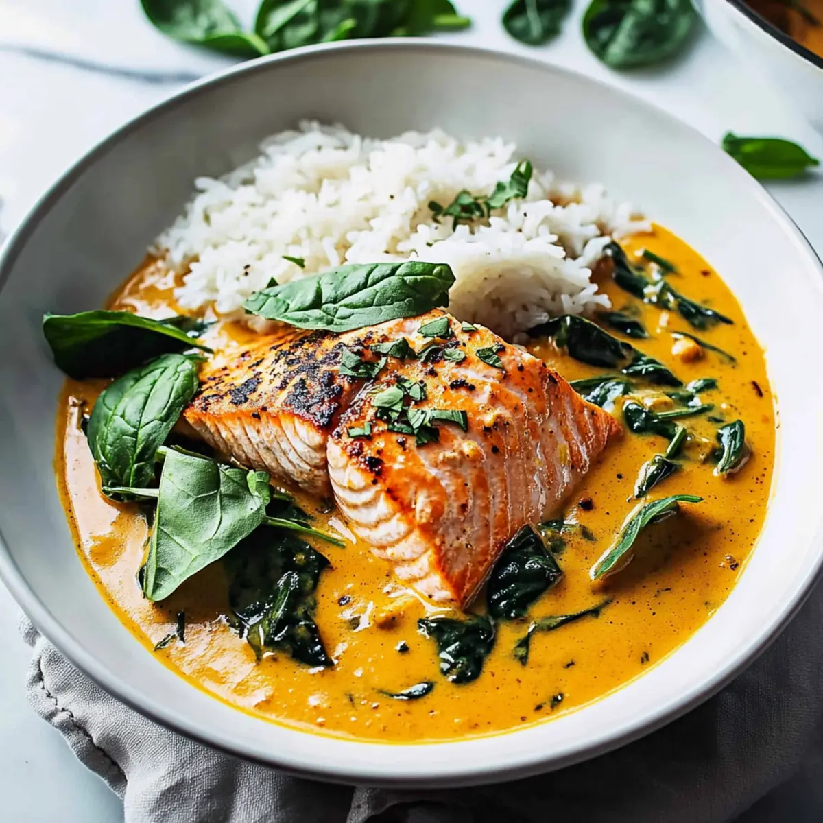 These Easy 30-Minute Coconut Salmon Curry ingredients are perfect for meal prep enthusiasts! You can prepare the spice rub and coat the salmon fillets up to 24 hours in advance, simply storing them covered in the refrigerator to maintain freshness. The coconut sauce can also be made ahead and refrigerated for up to 3 days; just reheat it gently on the stove before serving. When you’re ready to enjoy, bake the salmon as instructed, then add it to the warmed sauce and wilt the spinach for a delightful finish. This way, you’ll enjoy restaurant-quality results with minimal effort on busy weeknights!
