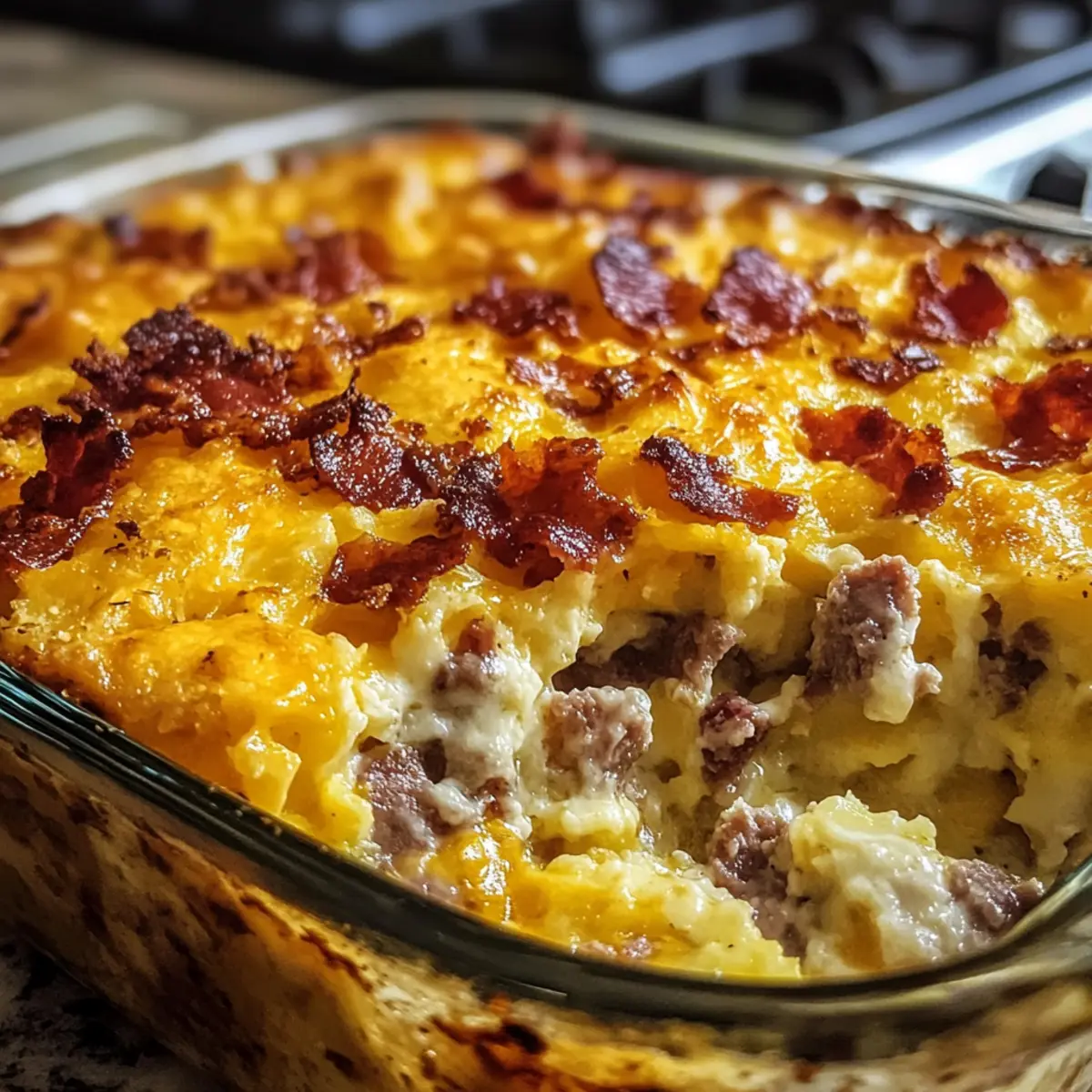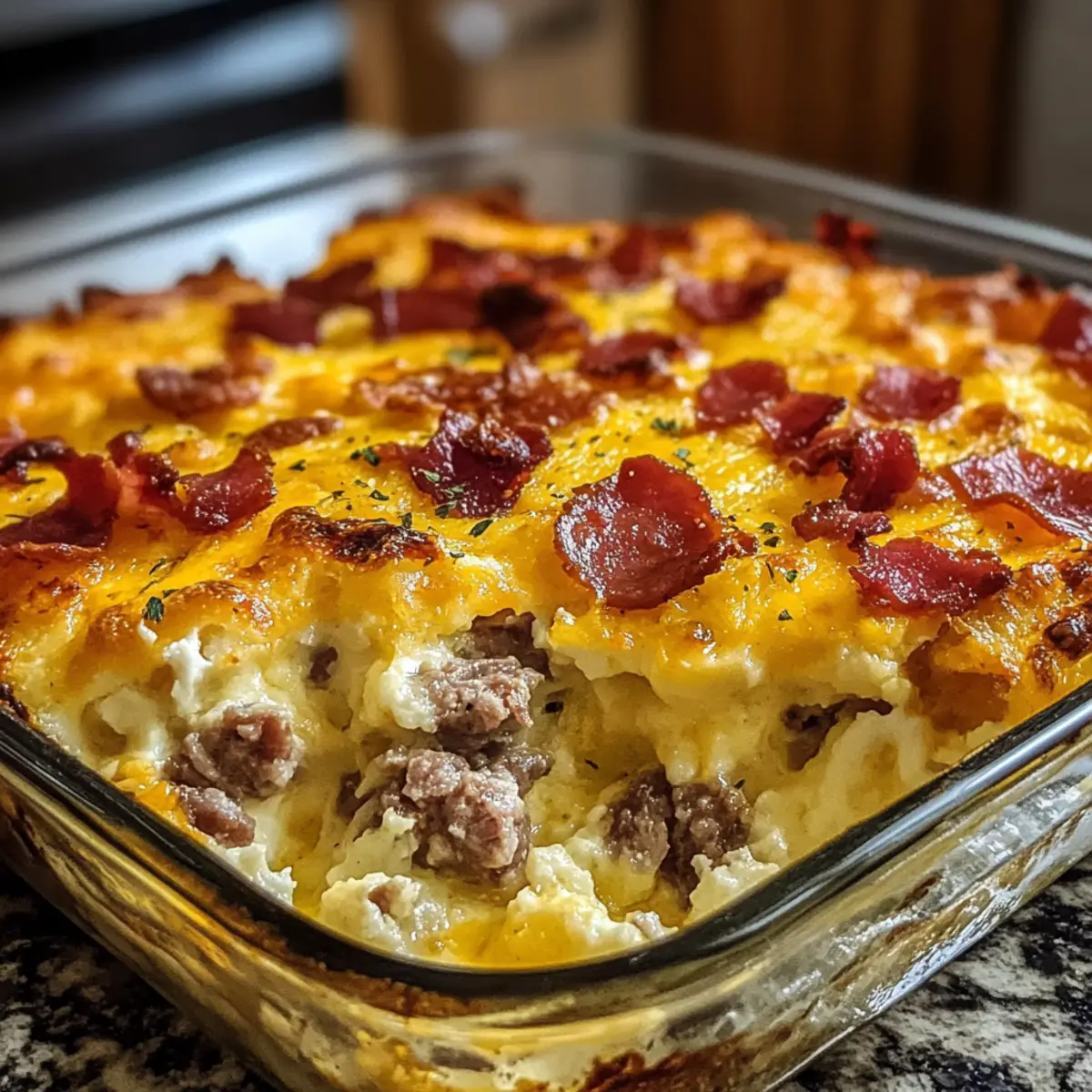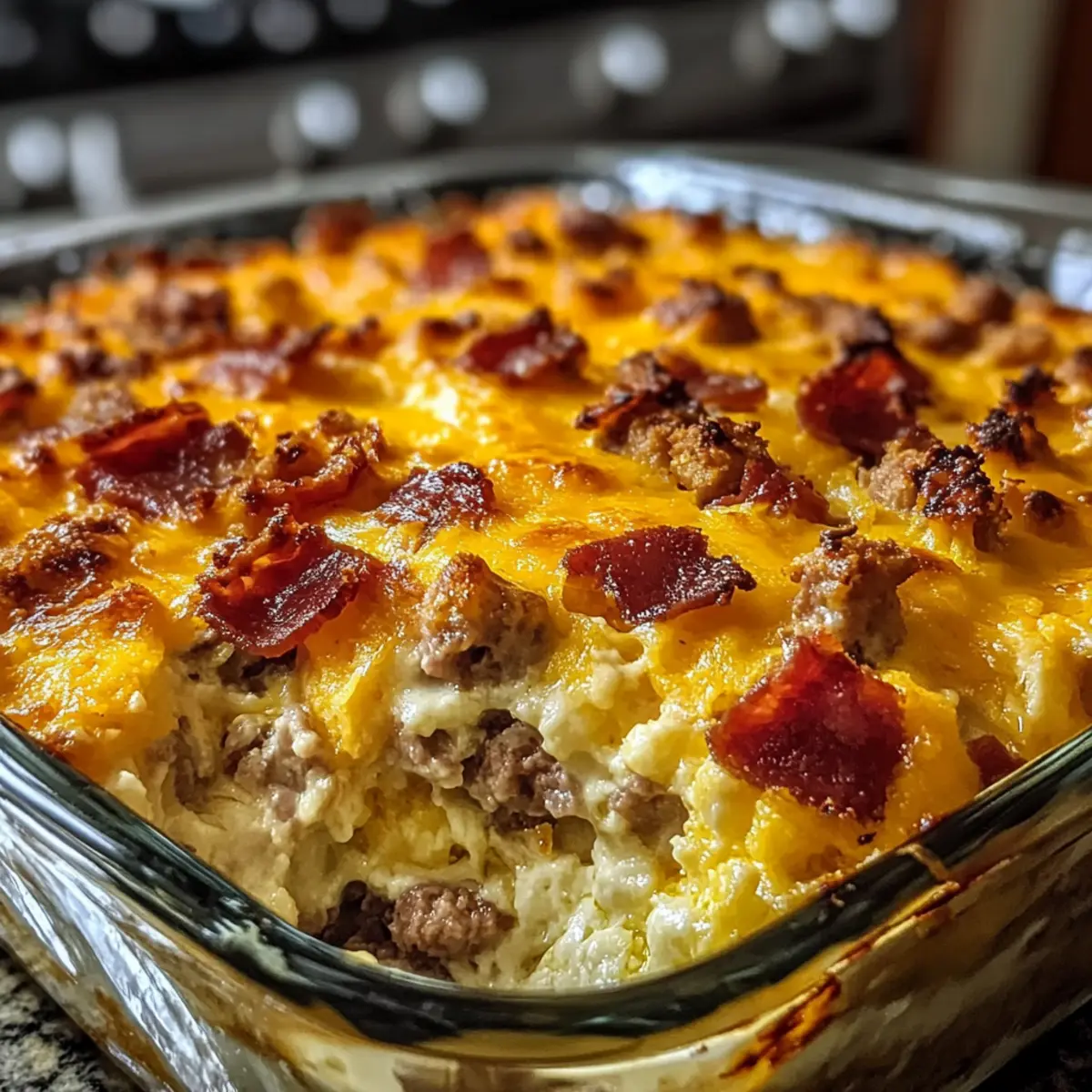 Deliciously comforting: The Crack Breakfast Casserole combines savory pork sausage, crispy bacon, and creamy cheeses for a breakfast experience that feels like a warm hug.
