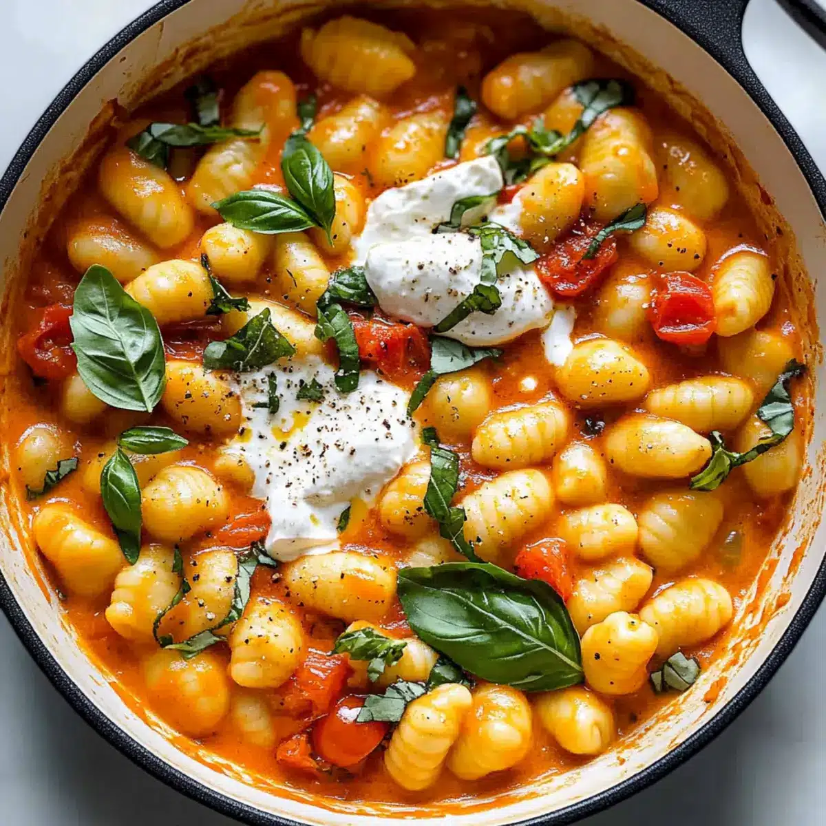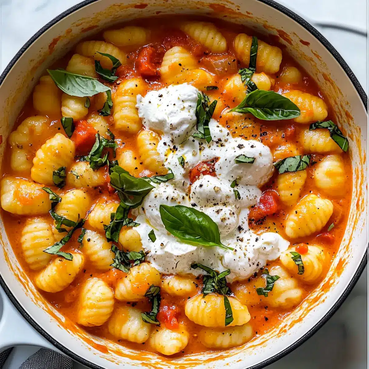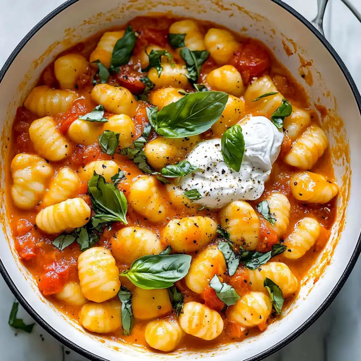 Yes, you can! For longer storage, freeze the creamy tomato gnocchi without the burrata in a freezer-safe container for up to 3 months. To freeze, allow the dish to cool completely, then portion it out and seal tightly. When ready to enjoy, thaw it overnight in the fridge, then reheat gently, adding a bit of water or cream for moisture as needed.