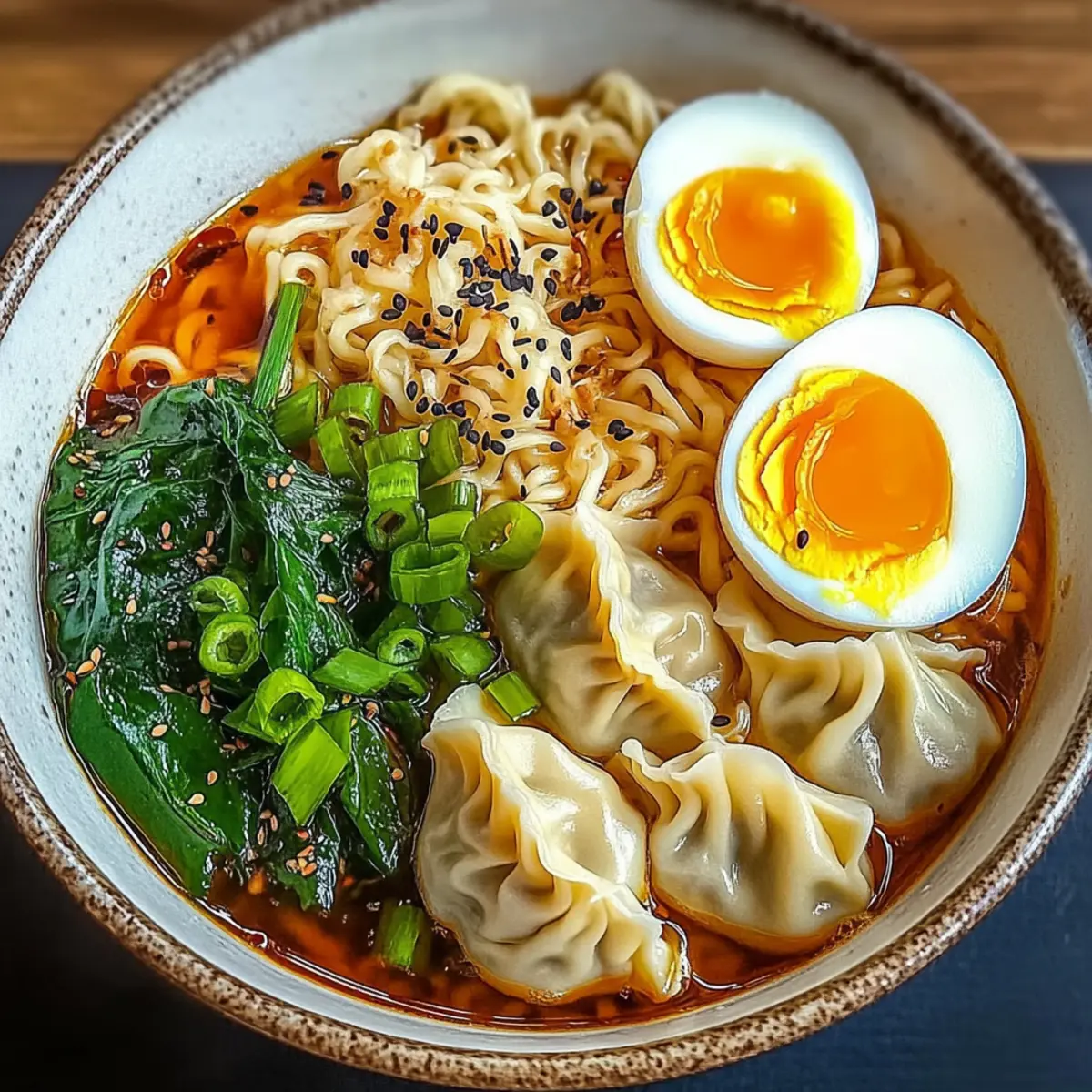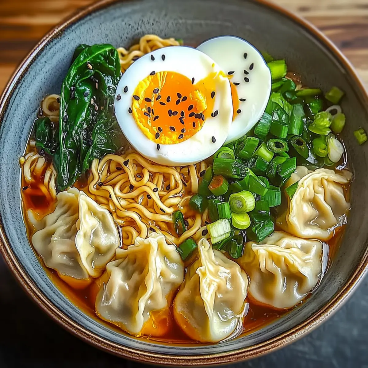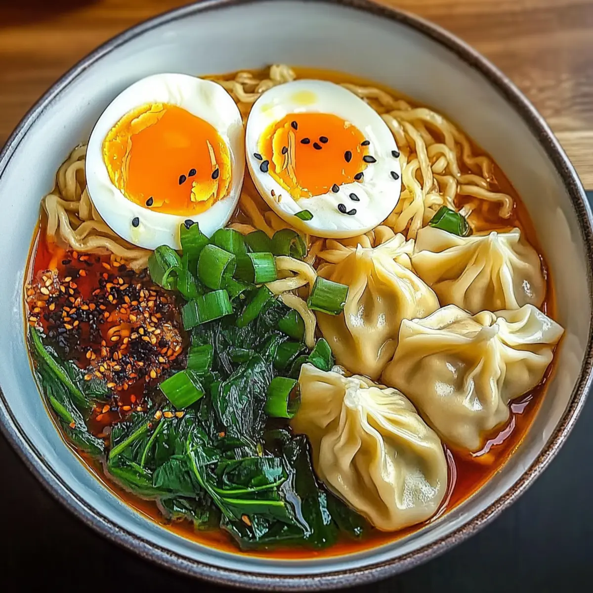 Divide the noodles, dumplings, and spinach equally into serving bowls. Use a ladle to pour the hot broth over each bowl, ensuring everyone enjoys the rich flavors. Garnish each bowl with halved soft-boiled eggs, a sprinkle of chopped green onions, and a dash of black sesame seeds for that final touch of elegance and flavor in your Dumpling Ramen Bowl.