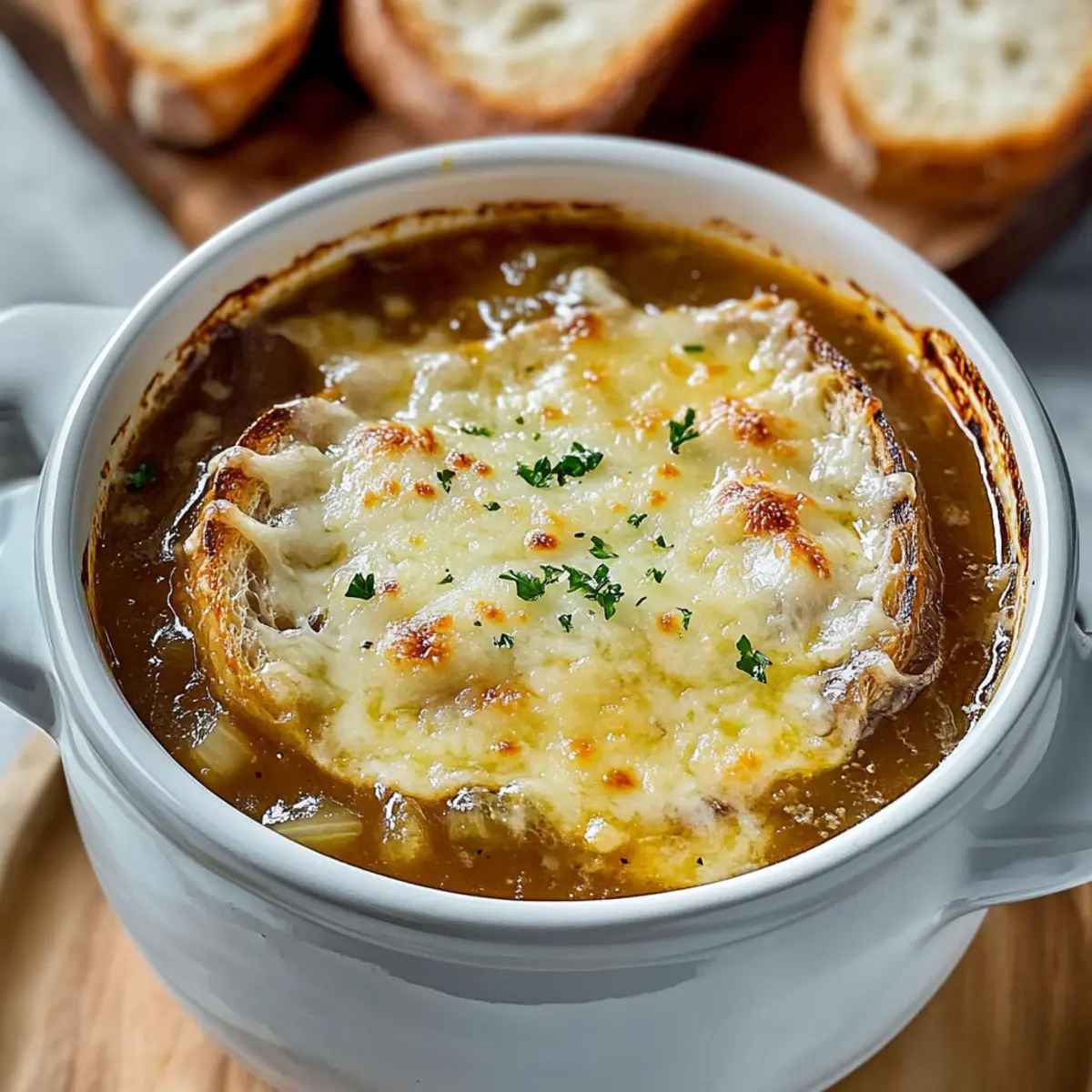 - Final Touches: Remove the bay leaf and thyme sprigs. Portion the soup into ovenproof bowls, add baguette slices, and sprinkle with grated cheese.