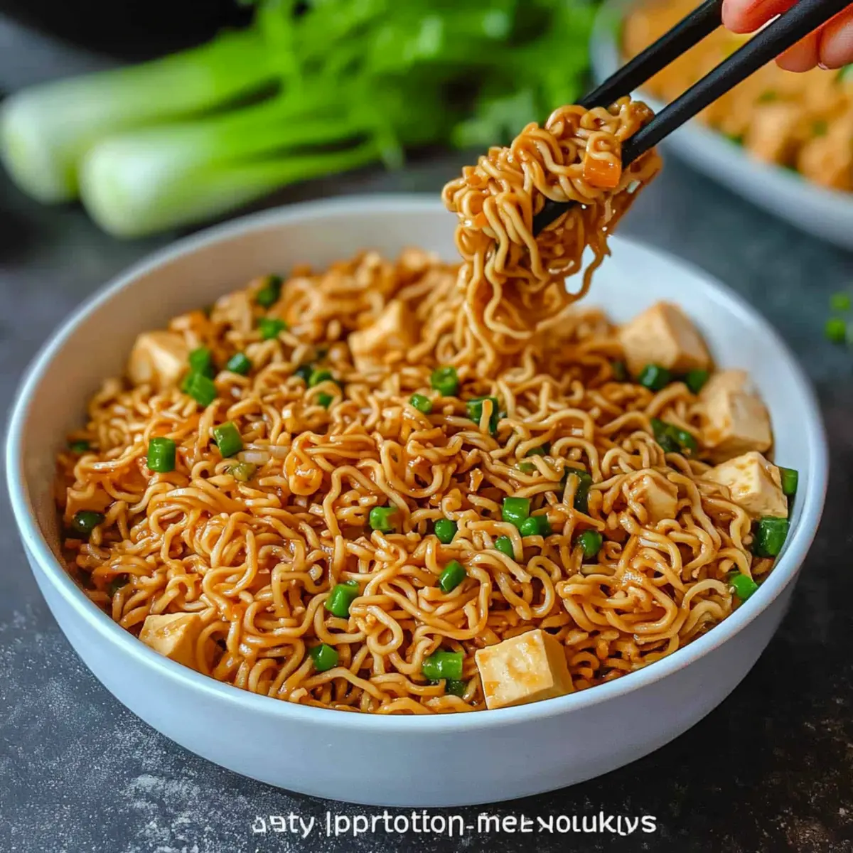 Add the partially cooked ramen noodles to the skillet, tossing gently to combine them with the warm sauce and stir-fried ingredients. Cook for an additional 3 minutes, allowing the noodles to absorb the rich flavors of the sauce, while stirring occasionally until everything is heated through. The noodles should take on a golden hue, signaling they’re ready to be served.