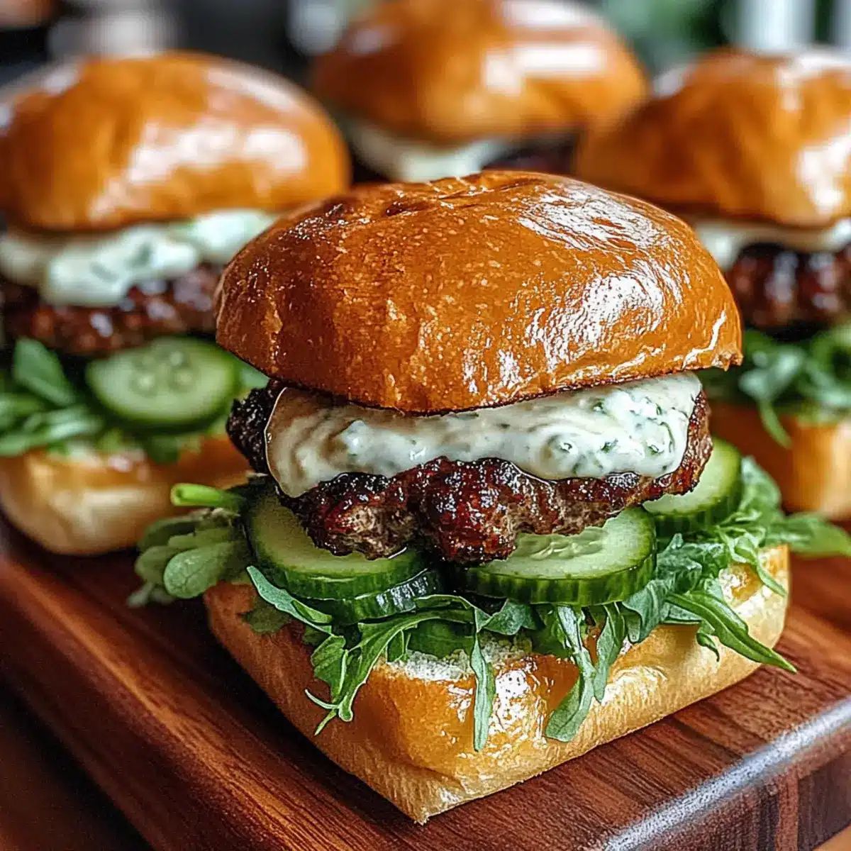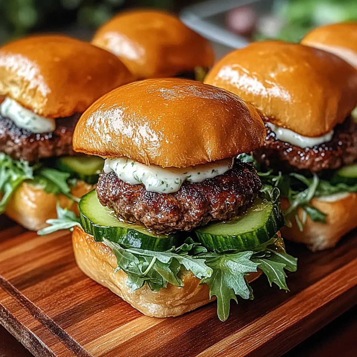 Spread a generous dollop of garlic aioli on the bottom half of each toasted brioche bun. Layer with a handful of mixed lettuce leaves, followed by the melty cheese-topped patties. Add the quick-pickled cucumber slices for that refreshing crunch and finish with the top half of the buns, completing your mouthwatering Juicy Burger Sliders.
