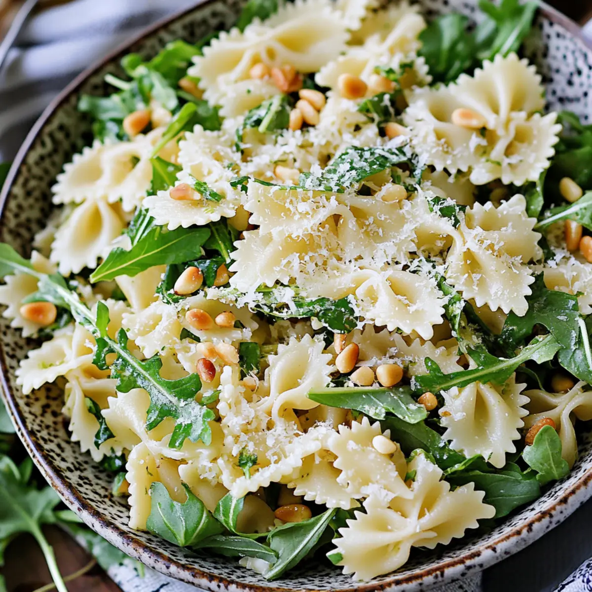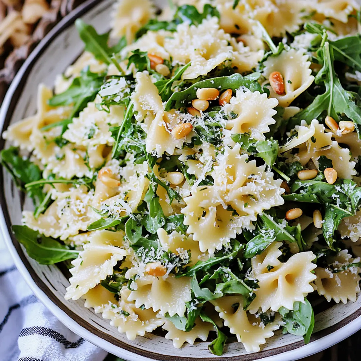 - In a large mixing bowl, combine cooled pasta, arugula, pine nuts, parmesan, and basil. Toss gently to mix.