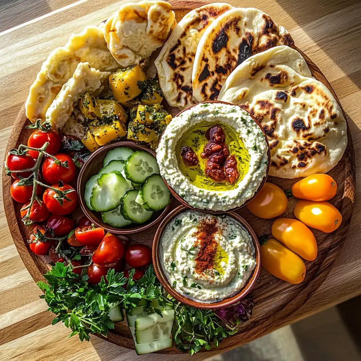 On a large serving platter or board, place the bowls of dips in an appealing arrangement. Surround the dips with clusters of the fresh vegetables and warm flatbreads. Create a vibrant display that invites your guests to dive into the assorted flavors and textures. This eye-catching composition is the essence of a stunning Mediterranean brunch board.