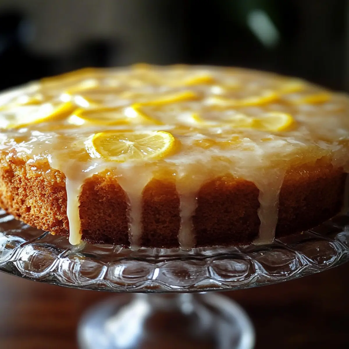 After the cake has cooled, gently invert it onto a wire rack to cool completely. While the cake cools, prepare the glaze by whisking together 1 cup of powdered sugar with 2-3 tablespoons of lemon juice until you achieve a pourable consistency. Once the cake has cooled, drizzle the glaze over the top, letting it flow down the sides. For added flair, top with thin slices of lemon if desired.