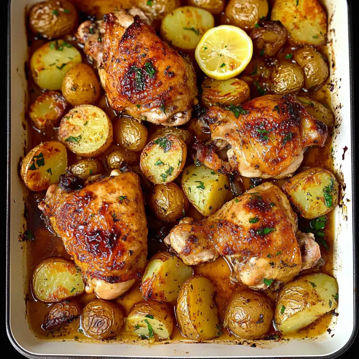 These One Pan Lemon Garlic Chicken and Crispy Potatoes are perfect for meal prep enthusiasts! You can marinate the chicken with the flavorful sauce and chop the potatoes up to 24 hours in advance, storing them in an airtight container in the refrigerator. This helps the chicken absorb the zesty lemon-garlic flavor while preventing the potatoes from browning. When you’re ready to cook, simply arrange the marinated chicken and prepped potatoes on your baking sheet, pour over the remaining sauce, and bake at 400°F (200°C) as directed. This preparation not only saves time on busy weeknights but also ensures a meal that’s just as delicious as when made fresh!
