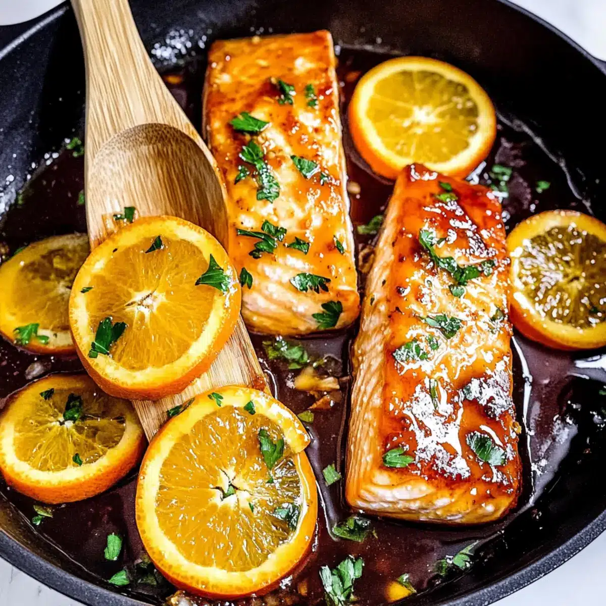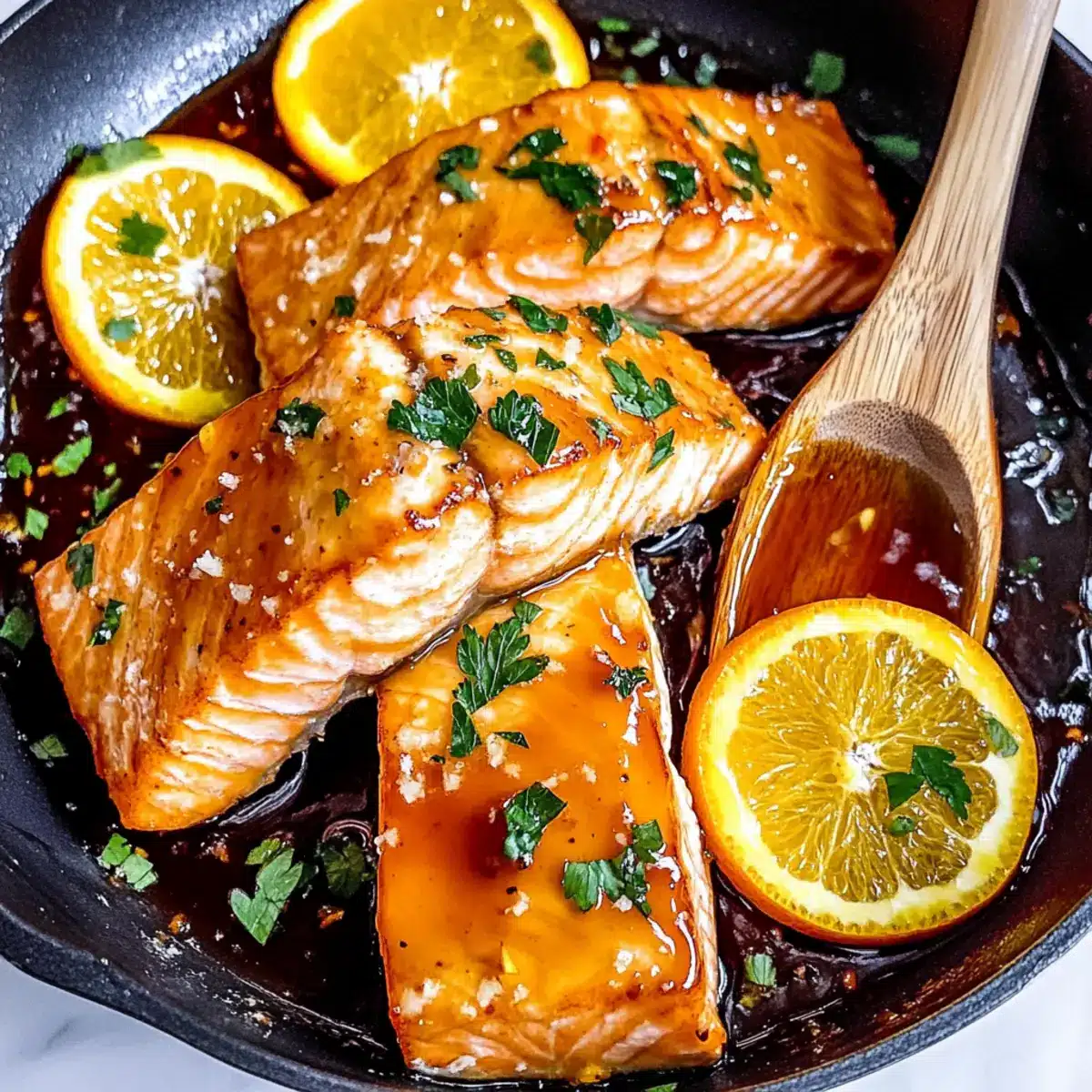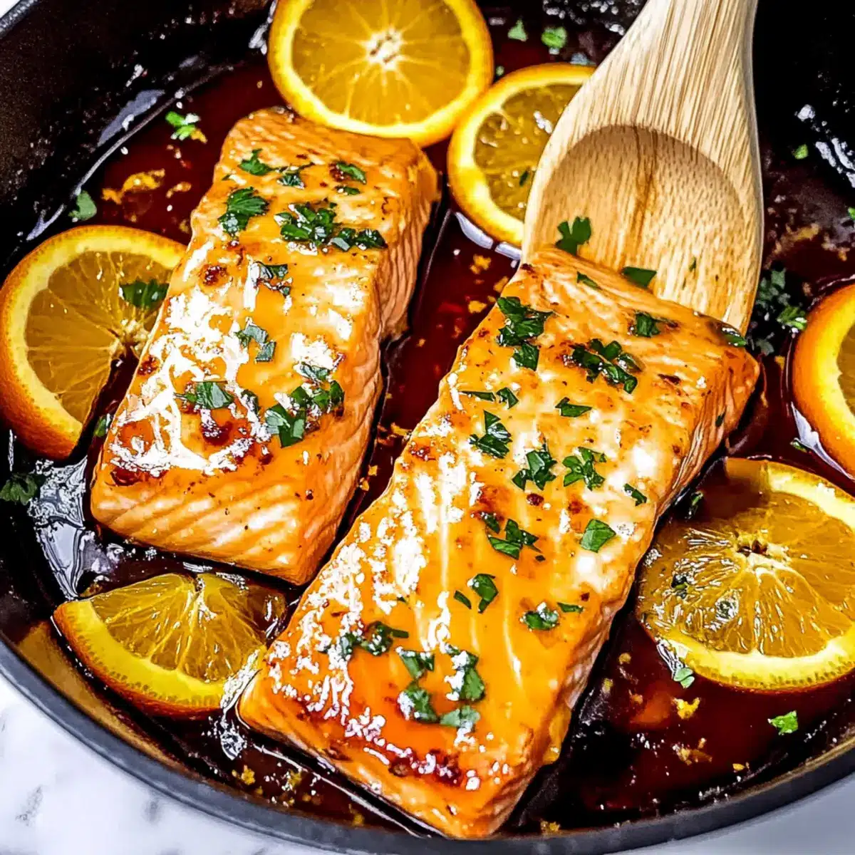 Once the glaze is nicely heated and slightly thickened, return the cooked salmon fillets to the skillet. Carefully spoon the glaze over each fillet, ensuring they’re well-coated. If desired, you can add sliced oranges at this stage for extra flavor. Let the salmon simmer in the glaze for another minute to absorb the delicious flavors.