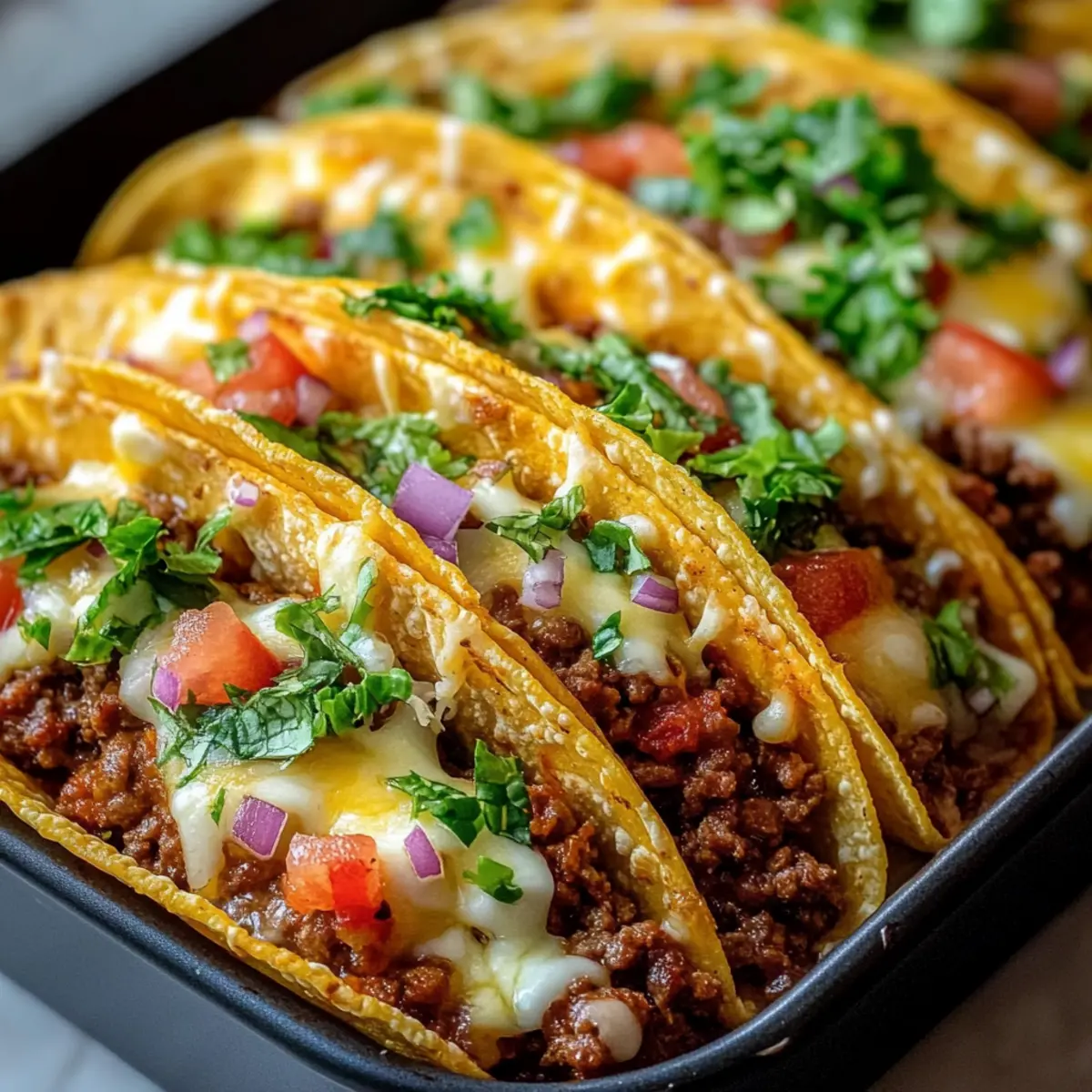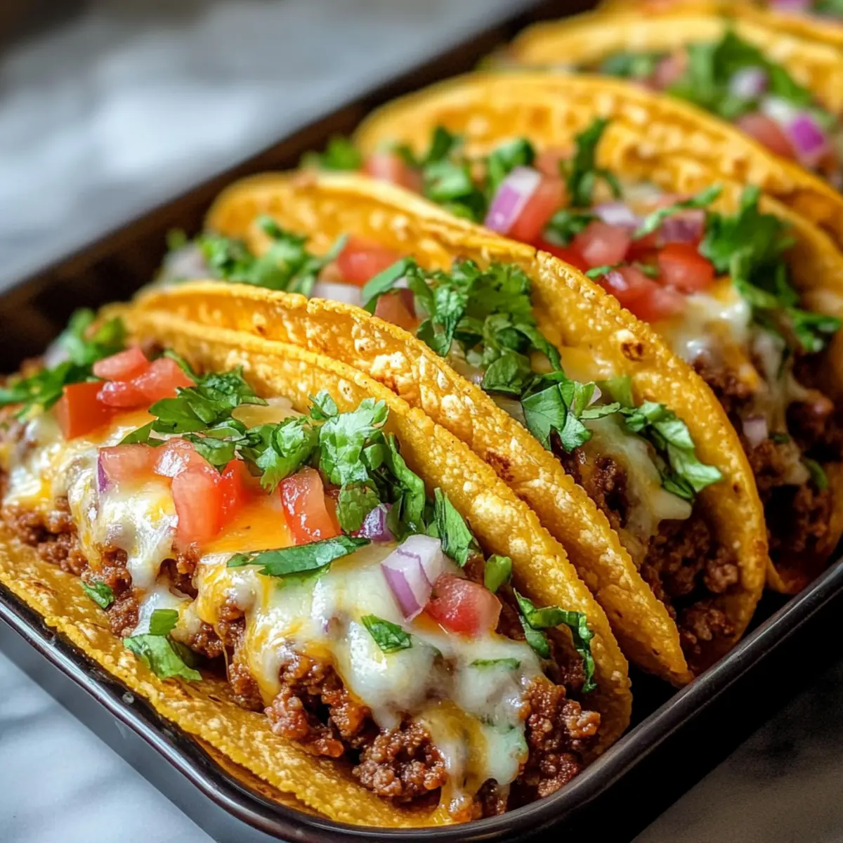 To reheat your leftover Oven-Baked Cheesy Tacos, preheat your oven to 350°F (175°C). Place the tacos on a baking sheet and warm them for about 10-15 minutes. This method keeps the taco shells crispy, which is essential for maintaining the perfect texture.