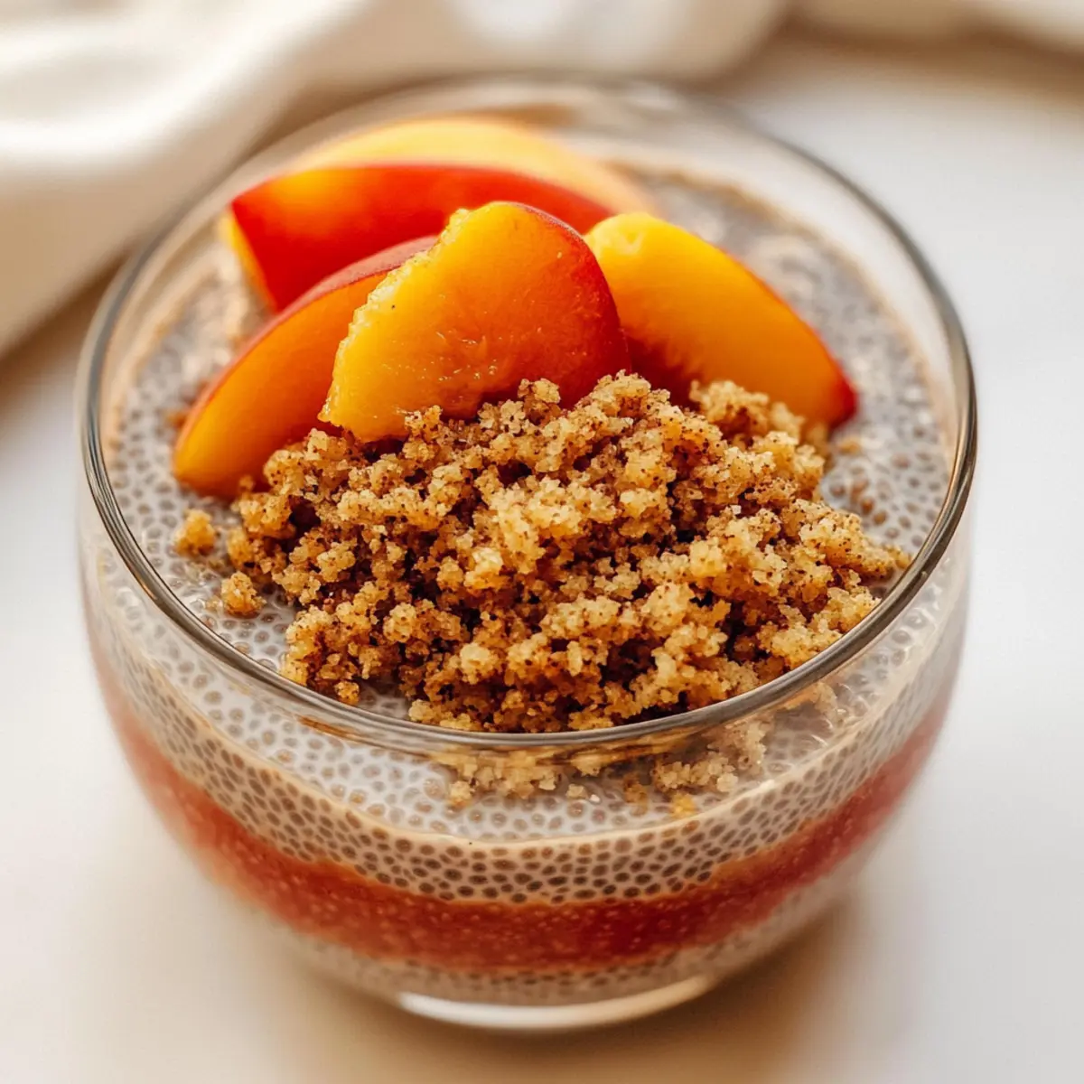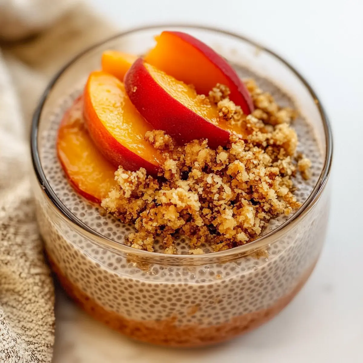- Layer the chia pudding in serving glasses and top with the cobbler crumb mixture. Garnish with sliced peaches if desired.