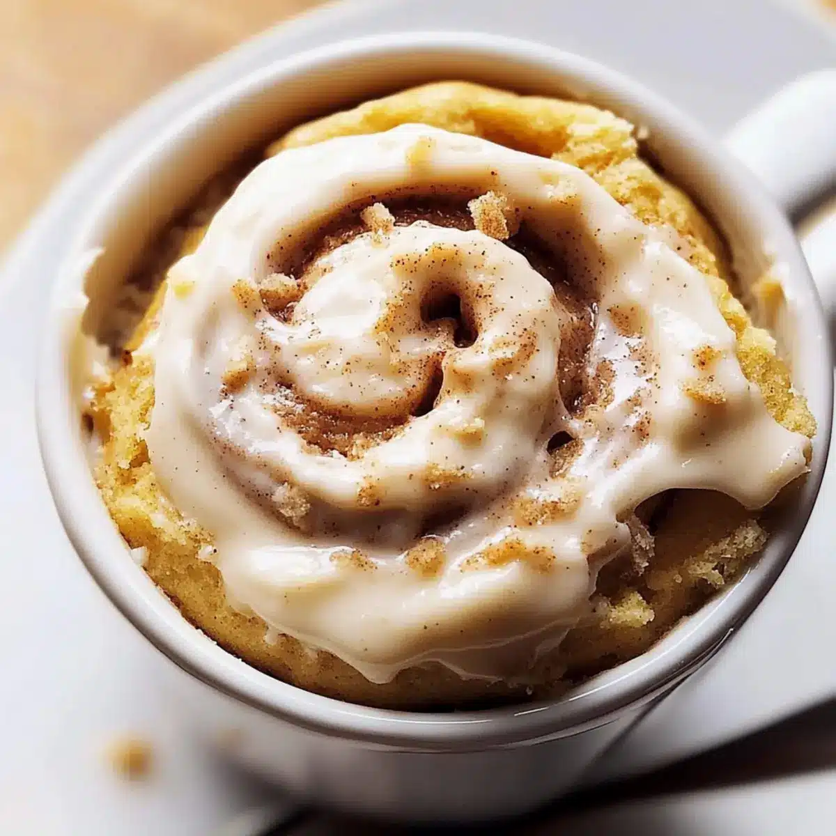- Frost the warm mug cake, allowing the frosting to melt into the cinnamon swirls.
