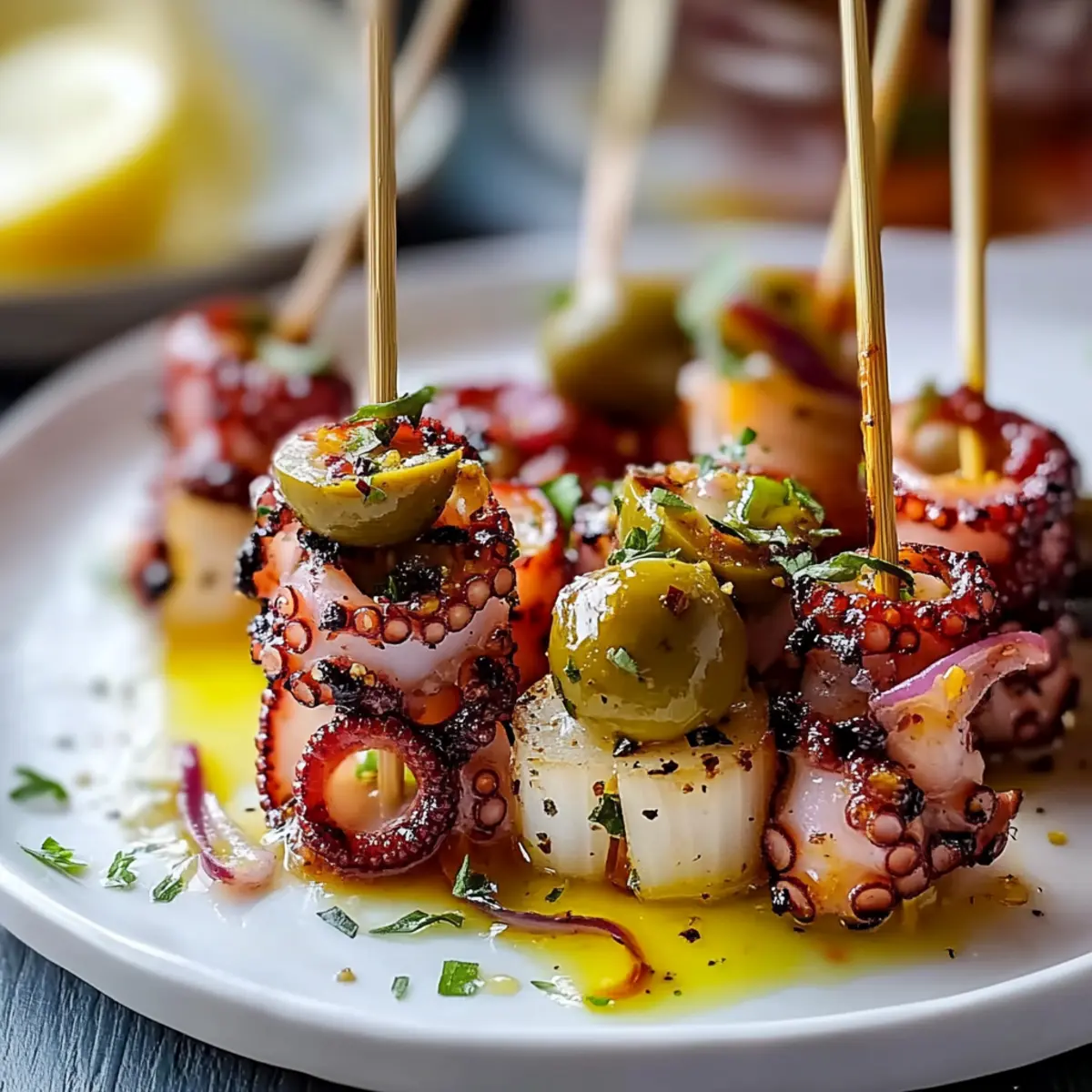 Definitely! While this recipe is generally Halal as it features octopus, always check for any specific dietary restrictions. If any guests have allergies, especially to seafood, be sure to inform them about the ingredients. Additionally, for those who may prefer vegan options, consider creating a similar skewer using just the olives, pickled onions, and roasted peppers, omitting the octopus entirely.